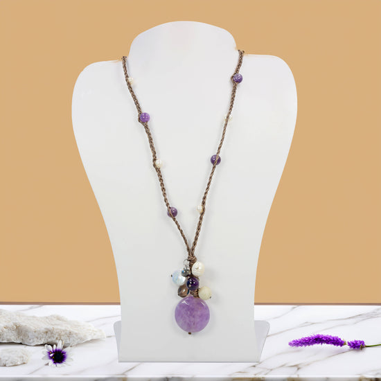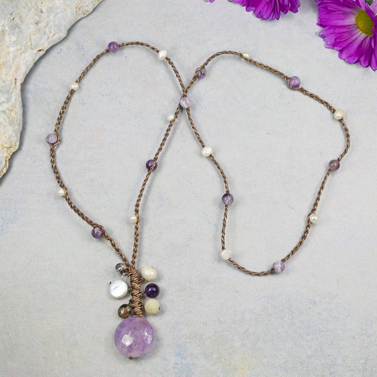 Embrace bohemian elegance with our Amethyst Bloom Leather Braid necklace. This unique 80cm necklace is hand-braided with genuine brown leather, showcasing a captivating drop pendant that extends to 7cm. The pendant features a large, faceted amethyst coin, its diamond-cut facets reflecting a vivid purple hue. Complementing the amethyst are clusters of handcrafted beads including soft green amazonite, smoky grey quartz, and luminous cultured pearls, all artfully woven into the braid. A charming sterling silver panda head charm adds a whimsical touch to the pendant drop. This necklace is a testament to handcrafted artistry, blending the rich texture of leather with the natural beauty of gemstones and the captivating sparkle of amethyst. With its unique braided design and no clasp, it drapes effortlessly, creating a statement piece that is both earthy and enchanting.