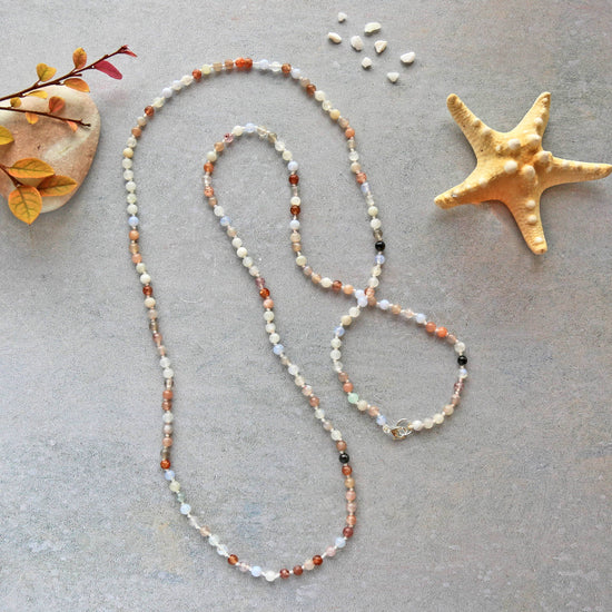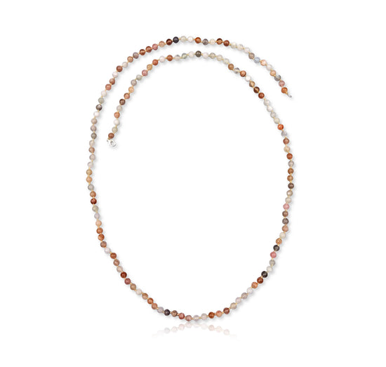 Embrace the ethereal glow of our Lunar Spectrum Long Strand. This 100 cm necklace features a captivating array of genuine multi-colour moonstone beads, each showcasing a subtle play of light and a unique blend of soft white, grey, peach, and occasional flashes of blue. Each bead is meticulously hand-strung and hand-knotted, highlighting the natural beauty and subtle variations of the moonstone. The necklace is finished with a secure 10mm sterling silver lobster clasp and extender, offering versatility in styling – wear it long for a flowing silhouette, doubled for a chic two-strand look, wrap on the wrist or layered with other favourites. This timeless piece adds a touch of understated elegance and celestial charm to any ensemble.