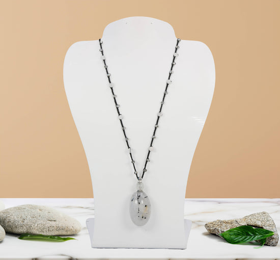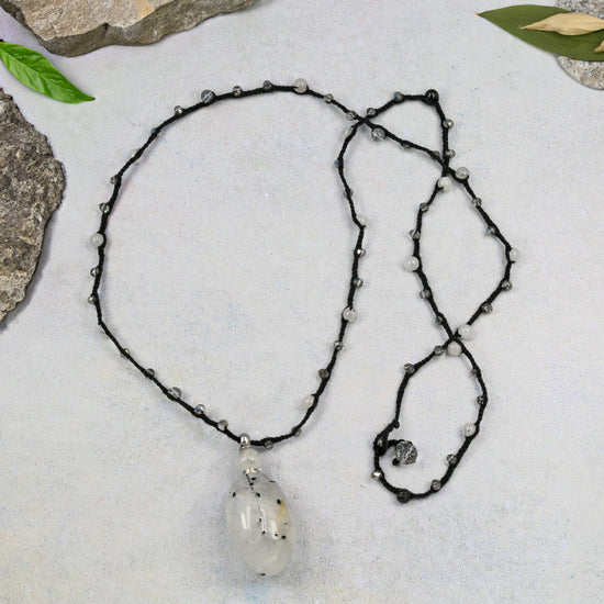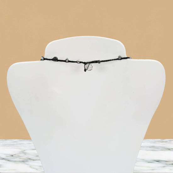 Experience the subtle fusion of natural beauty and personal fragrance with our Whispering Stone Aromatherapy Necklace. This unique 80cm necklace features a hand-crocheted beaded strand adorned with petite, matching gemstones and crystals. Suspended from the strand is a handcrafted gemstone perfume bottle pendant, measuring approximately 2cm in width and 4.5cm in length. This pendant can be used as a simple gemstone ornament or to subtly diffuse your favourite perfume or essential oil – the fragrance gently emits from a small gap in the bottle's mouth. The necklace comes with a plastic essential oil dropper for easy filling. Please note that due to the natural variations in each gemstone and the handcrafted nature of the bottle, each pendant will be unique in size, shape, colour, and markings. Designed without a clasp, this necklace offers a continuous, flowing style.