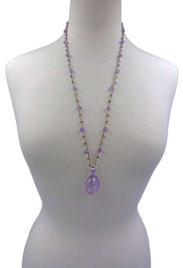 Designed with a unique crystal bead clasp for closure, this necklace offers a continuous, flowing style. Please note that due to the natural variations in the amethyst stone and the handcrafted nature of the bottle, each pendant will be unique in size, shape, and colour.