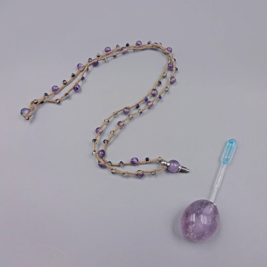 Experience the calming essence of amethyst with our Amethyst Bloom Aromatherapy Necklace. This unique 80cm necklace features a hand-strung beaded strand adorned with petite, round amethyst beads and sparkling crystals. Suspended from the strand is a handcrafted amethyst perfume bottle pendant, showcasing the stone's beautiful purple hues. This pendant can be used as a simple gemstone ornament or to subtly diffuse your favorite perfume or essential oil – the fragrance gently emits from a small gap in the bottle's mouth.