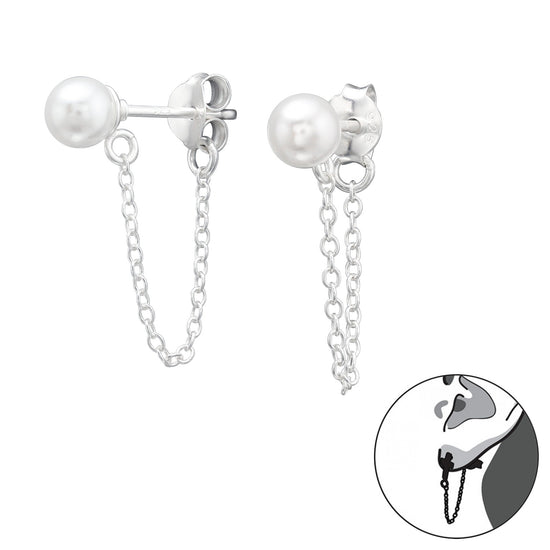 This pair of cheeky stud set features a faux pearl bead with a chain that hangs below the ear.