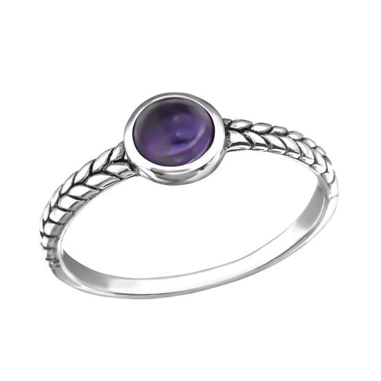This angelic Oxidized Ring with Amethyst is crafted from high-quality 925 Sterling Silver with Oxidized + E-Coat finishing. This piece has a delightful amethyst solitaire gem that measures 7 mm x 7 mm.