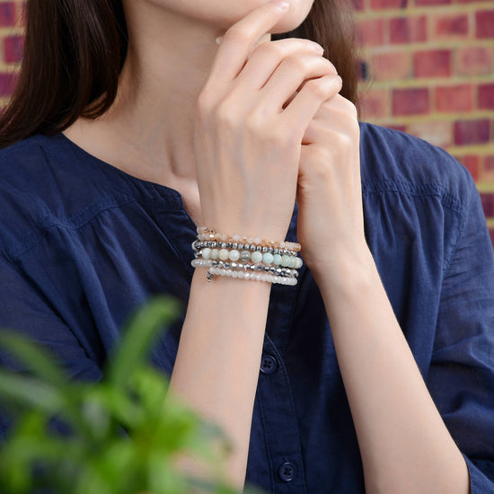 This beaded memory wire bracelet in one continuous piece twines around your wrist in an array of crystal and matte amazonite stone beads. Set on stainless steel flex memory wire this bracelet is hand beaded.