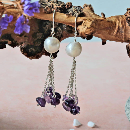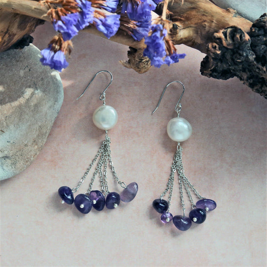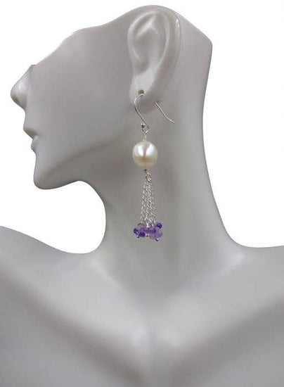 These long earrings move as you do and are sure to catch the eye. Crafted with the enduring blend of amethyst and freshwater pearl these stylish earrings are set on a sterling silver hook. Silver plating on the headpins finishes the look.