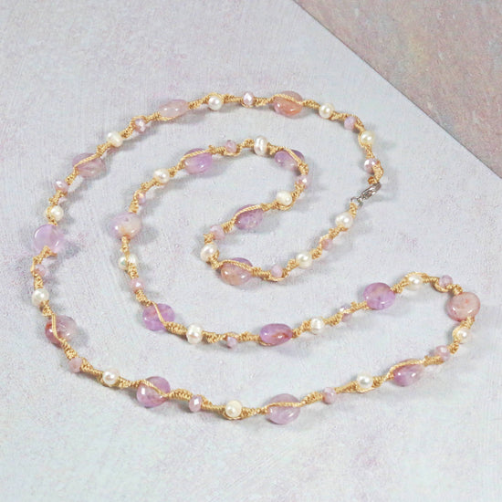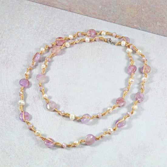Amethyst and cultured Pearl are twisted and spiral knotted in this unique and organic-looking necklace. The coin shaped amethyst and the cultured freshwater pearls are hand knotted with faceted crystals in a violet colour. The twisted thread gives this pretty necklace a luxe feel suitable for wearing to many occasions.