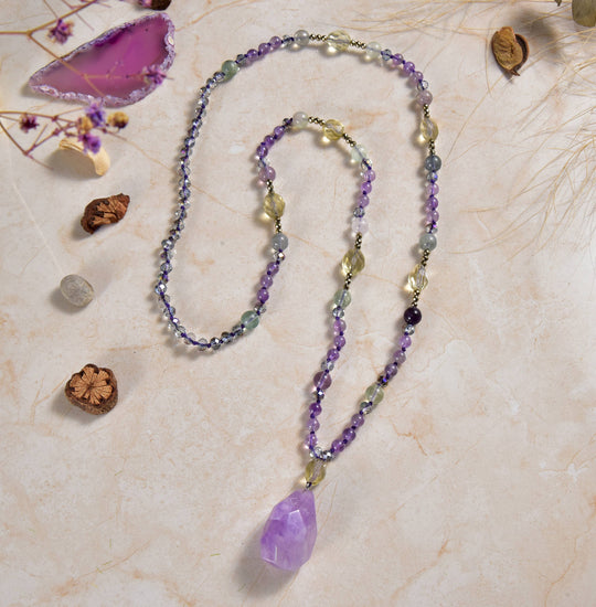 This delightful necklace is a colourful celebration of semi-precious stones. The design features amethyst, lemon quartz, rainbow fluorite, hematite beads, and crystals. The charming amethyst freeform pendant adds a unique touch. Measuring at 76cm in length, this necklace is sure to become a special favourite.