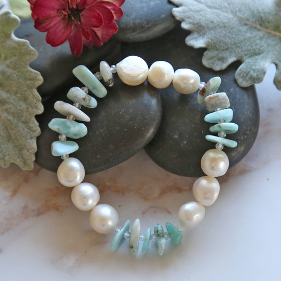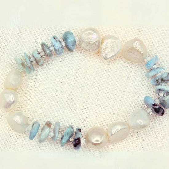 Catch the suns rays in the crystal beads on this simply lovely summer bracelet. Adorned with Larimar semi precious stones and freshwater pearls, and set on a stretch band for a cool fit, this is your ultimate sunny day choice.