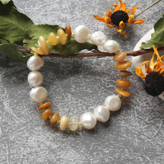 This authentic and natural stretch bracelet features beaded freshwater Pearls, polished genuine Yellow Jade stones and added crystals for a unique touch. Hand beaded on heavy duty stretch cord, it has generous 9-10mm pearls complemented with the richness of the yellow jade.