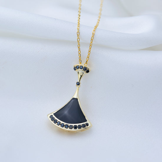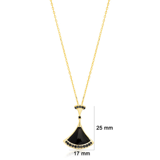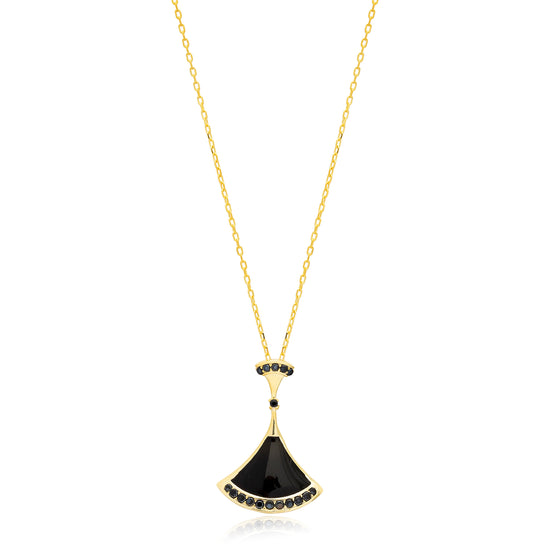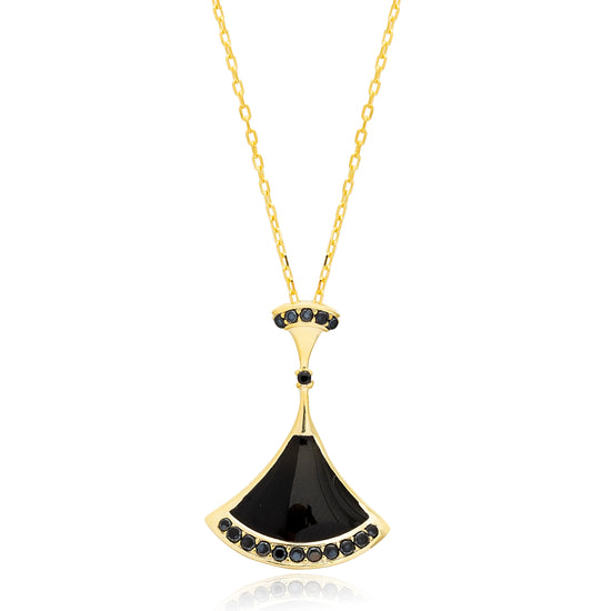 Indulge in the intricately designed black cubic zirconia stones, paired with sleek black enamel in a lavish, yet sophisticated fan necklace. The popular fan designs of the Art Deco age have come roaring back this year and this necklace is a delightful interpretation of the style with a mix of black and gold accents. Crafted in quality sterling silver with a lavish coat of gold plate this is a quality accessory. Perfect for adding some sophisticated flair to your look, it's a must-have accessory this season!