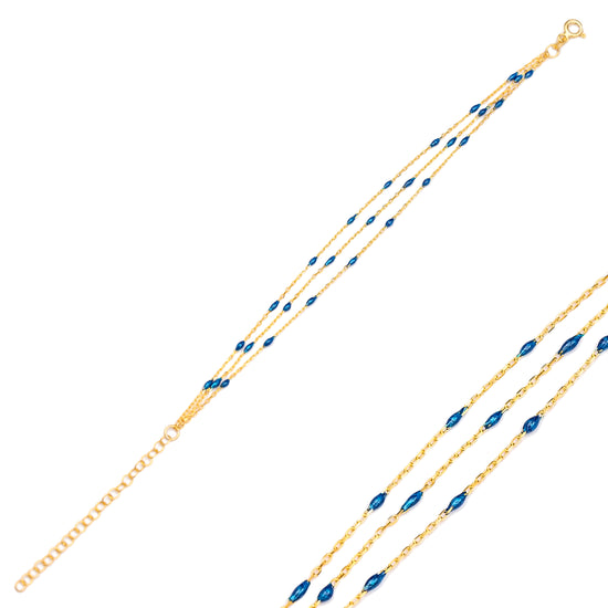 This delicate triple chain sterling silver bracelet is dotted with blue enamel to create the perfect fusion of style and femininity. This adorable handmade bracelet is of the latest European design. With a choice of either shimmering silver or glistening gold plated silver both are Perfect for Summer days!