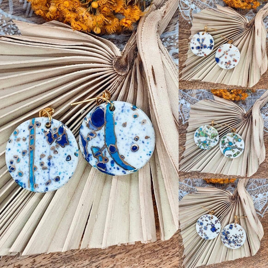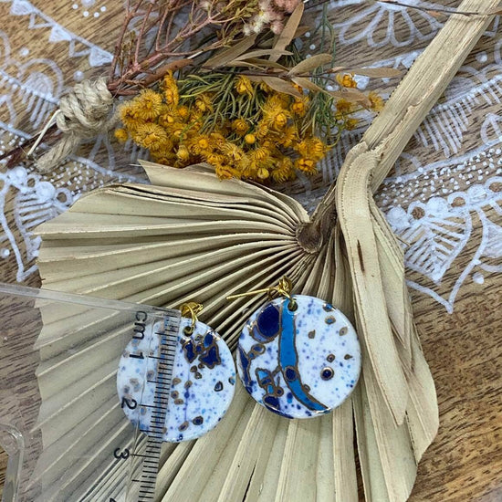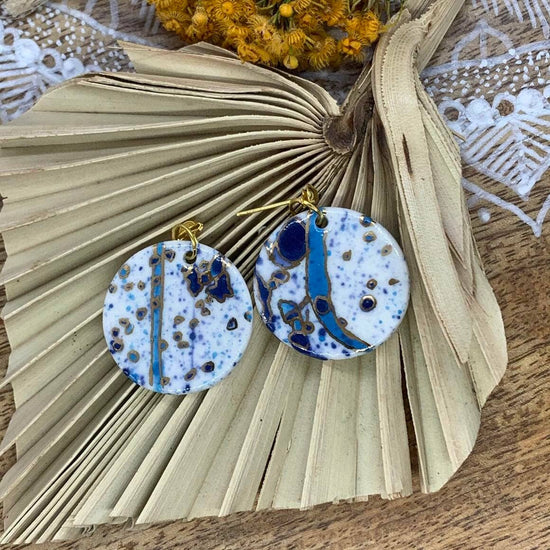 Nothing screams Summer quite like the splash and colour of water under the Australian sun and these amazing blue and turquoise ceramic earrings are exactly that. With random patterns in blues and turquoise overlaid with gold detail, these Summer drops are standouts.