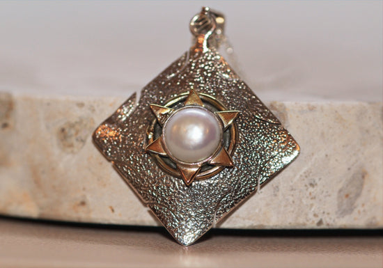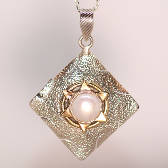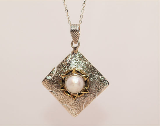 This very striking pendant is made from sterling silver with gold plated highlights that enhance the design. It is hand crafted with a central pearl inset and is a very individual piece that captures both the sun and the moon symbolism in its form. Being handmade this original silver pendant is very unique.