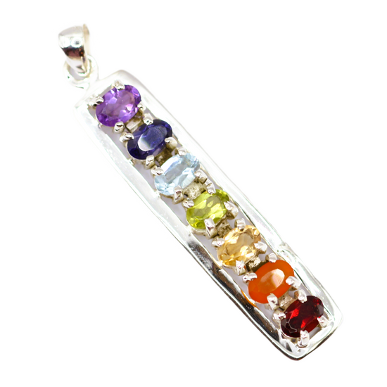 This exquisitely made sterling silver pendant holds the semi precious stones Amethyst, Iolite, Topaz, Peridot, Citrine, Cornelian and Garnet in a high shine silver casing. The seven stones representing the seven chakra.