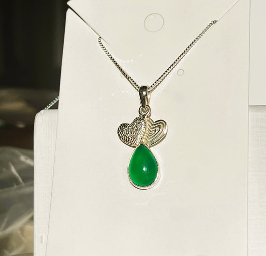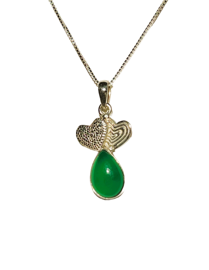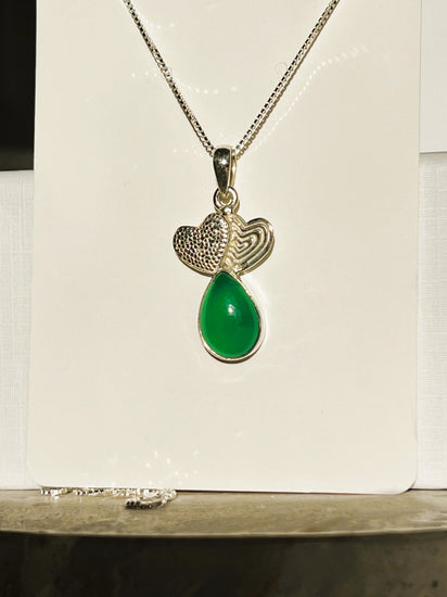 This exquisite pendant features two silver hearts paired with a green chalcedony gemstone. Expertly handcrafted from high-quality sterling silver, it offers a unique and elegant design. This pendant comes on a sterling silver box chain.