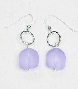 Look effortless and elegant with these eco-friendly cultured sea glass earrings. Each sterling silver links are hand-hammered adorned with pebble shaped cultured sea glass in beautiful periwinkle.