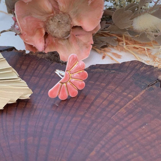 If you want to make a statement go no further than this handmade Porcelain Ring with gold finish in the print and a lush pink background.