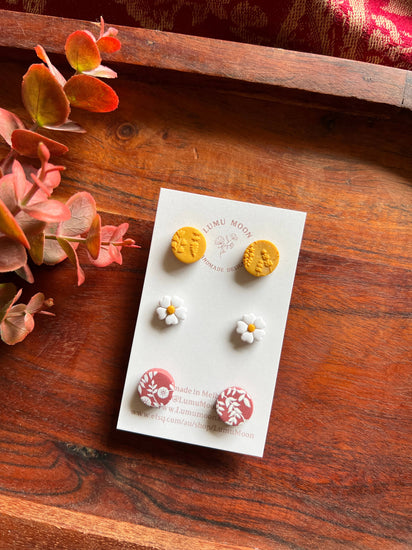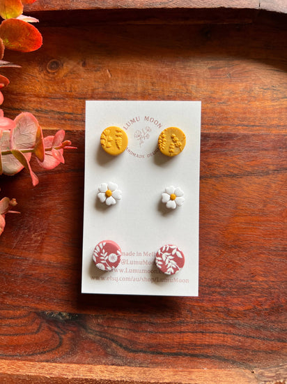 The inspiration behind these delightful stud earrings is by Lumu Moon, a Melbourne based designer. The stud earrings in this stud pack are handmade using lightweight polymer clay. Surgical steel posts have also been used making them friendly for sensitive ears.