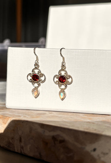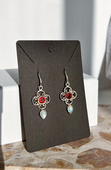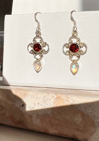 These beautiful sterling silver open earrings hold a deep resonating garnet gemstone in an open design. The earrings swing freely drawing the eye with the light catching gemstone. Anchored by a rainbow moonstone and set in cool silver, these earrings are perfect day to night wear.