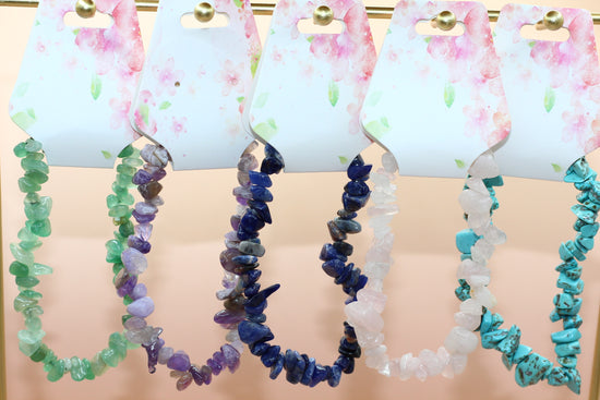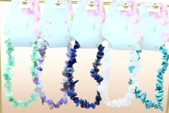 Explore the power of crystals and stones with these genuine gemstone chip bracelets. These bracelets make special and meaningful gifts, as they come from the heart.