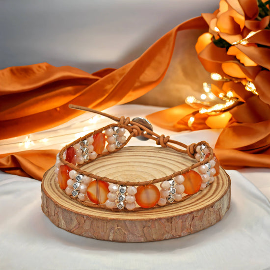 Adorn your wrist with this stunning gemstone and crystal leather bracelet for a laid-back, yet stylish look. Featuring the vivid colours of Carnelian, accented with shimmering crystals and silver-tone beads, this piece complements tanned summer skin with its rich vibrant tones. Hand-woven onto tan leather, this single-strand wrap bracelet boasts an adjustable closure for a perfect fit Get ready to embrace the relaxed, yet refined vibe of this one-of-a-kind accessory.