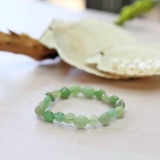 Bring a little luck into your life with this delightful Aventurine nugget bracelet. Aventurine, called by some the Stone of Opportunity, is also considered to attract good luck. The Aventurine stone is a glistening soft green that reflects shards of light from within giving a glistening effect. As with all true gemstones it feels cool to first touch and soft against the skin. This bracelet is hand beaded on quality elastic with free form nuggets of different shapes and sizes that highlight the authentic nature of the stone.