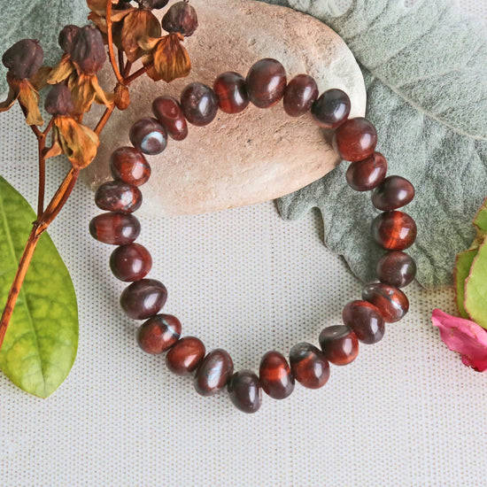 Enjoy the opulent deep colour in this red Tigers Eye bracelet. Each bead is hand beaded on a high quality stretch cord.