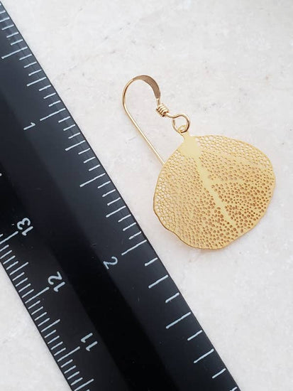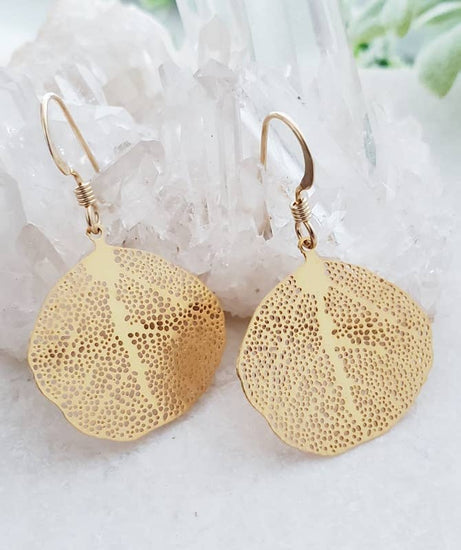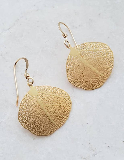 The fluttering aspen leaf is recreated as delicate filigree earrings that flash and flitter as you move. The gold dipped brass leaves sit on 14k gold filled fine French wire hooks.