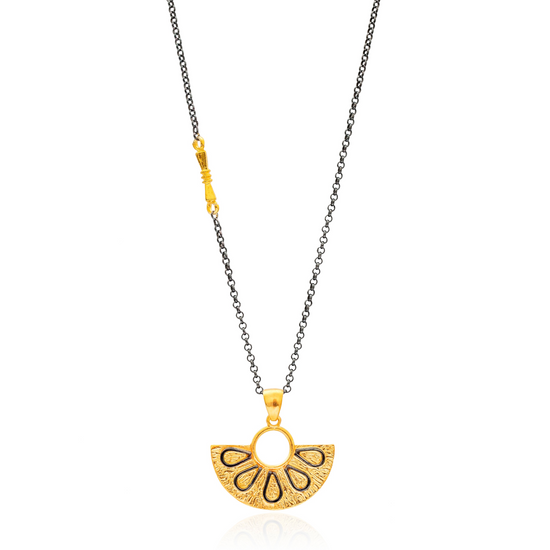 Make an impact in this black and gold sterling silver necklace featuring a half circle charm on a black silver chain. Exotically stylish and very modern you will keep this necklace as a special item in your collection for a long time.