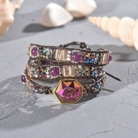 This wrap bracelet has a strong presence with Amethyst beads and a shining druzy pendant on genuine leather and sparkly crystals.