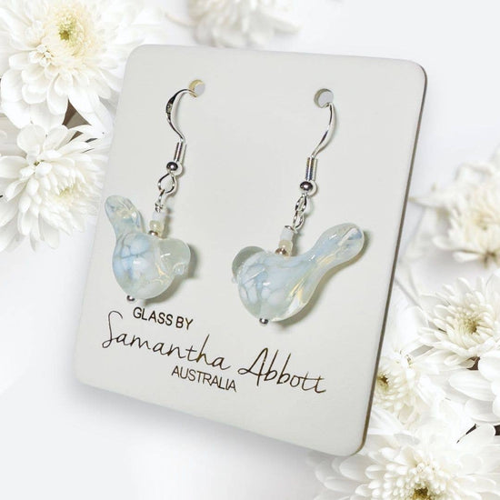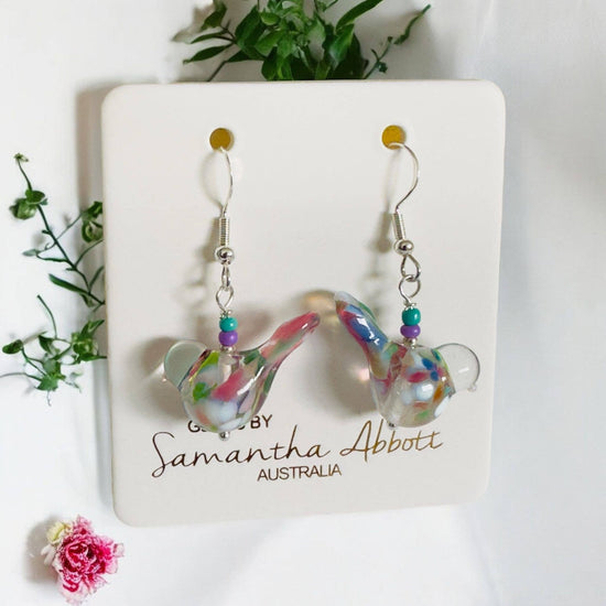 Available in a range of vibrant and unique colors you will love. Designed and hand crafted by Glass Artist Samantha Abbott, these adorable Glass Birds Drop Earrings show case original and unique colors exclusive to her range of designer glass. Size of each tiny bird varies but all fall within 2 cm x 2 cm