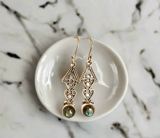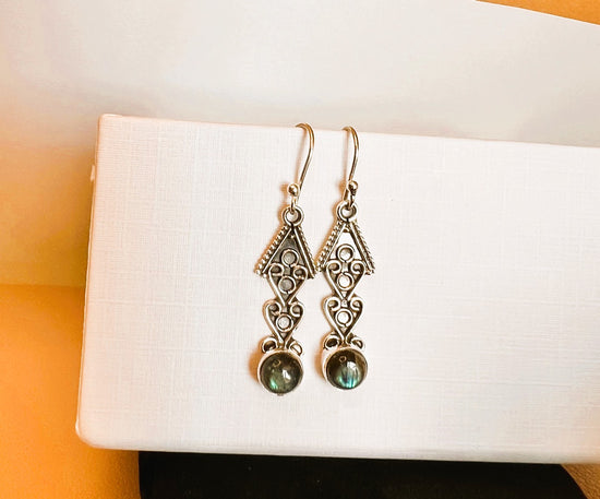 Draw attention for all the right reasons wearing these luxury labradorite earrings. These dangle earrings, crafted in sterling silver create an ethnic vibe that is charmingly enhandced by the magic Labradorite gemstones. Absolutely lovely and unique, these special earrings will be your next everyday piece.