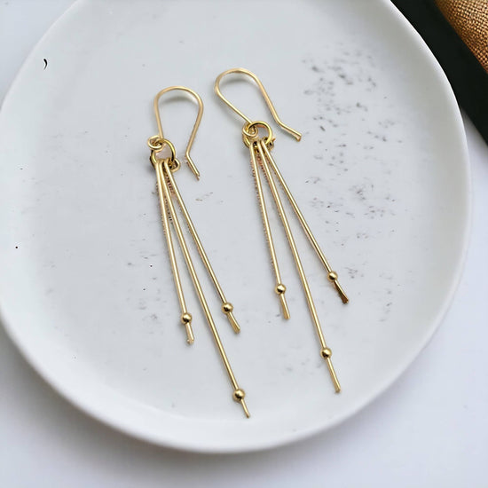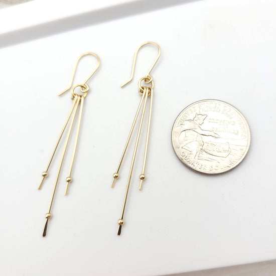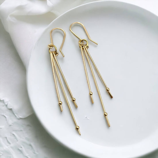 These luxe gold and silver dangle earrings are handmade with 14k Gold Filled wire and beads.