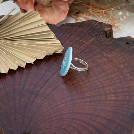 Hand created in the Wolf and Clay studio in the Hinterland of Agnes Water QLD in Australia. Each piece is fired multiple times in a kiln, with temperatures up to 1250 Celsius degree. This gives it a stone like appearance as well as sustainable qualities such as it doesn’t absorb water, has a stone feel to it and absorbs body temperature.. Each charming unique piece is then glued onto an adjustable silver tone ring for comfort and a perfect fit. Designed and handcrafted by the Australian artist Wolf and Clay.