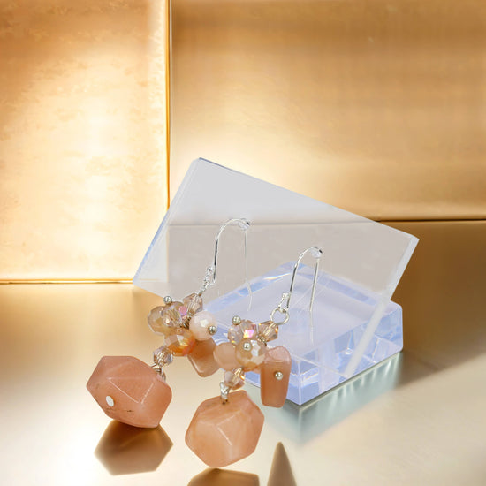 Sterling silver drop-down earrings made of genuine Sunstone gemstones and clusters of faceted crystals wired together and set on a sterling silver hook.