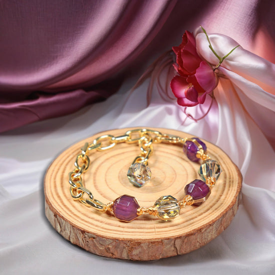 Highly fashionable chunky paperclip style bracelet with purple Amethyst gems nested among auroral boreal colour crystals and gold tone copper wire, this modern style bracelet is perfect for both dressy and casual occasions.