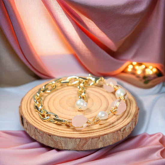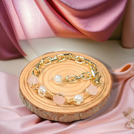 Highly fashionable chunky paperclip style bracelet with soft rose quartz gems nested among freshwater pearls and gold tone copper wire, this modern style bracelet is perfect for both dressy and casual occasions.