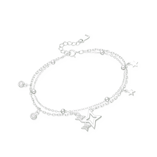 Dazzle the world with the pure silver elegance of this 925 Silver Stars Bracelet. This sterling silver bracelet features silver star charms and cubic zirconia on its layered chain design. Layering is highly fashionable and this high quality example will twinkle prettily through the day to night.