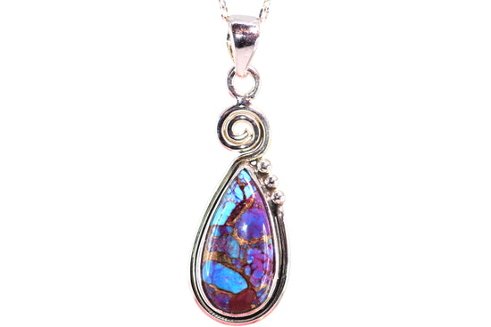 This is a lovely teardrop Purple Copper Turquoise Pendant set in solid sterling silver. The colour combination in the stone is a lovely blend of golds, purple and turquoise. The stone is set in a teardrop frame that is embellished with silver drops and hangs on a swirling flourish of silver.