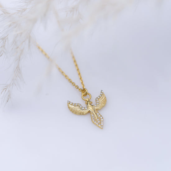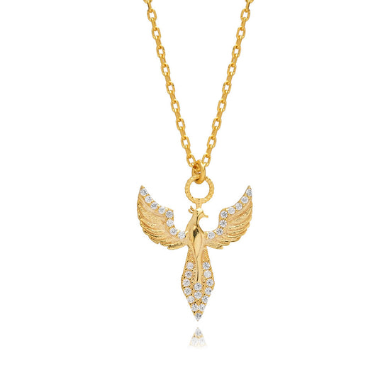 Keep the ancient myth of the Phoenix as your talisman as you embrace a new life from the old. The mythical bird serves as a symbol of rebirth and renewal, and the stories tell that it turns bad luck into good fortune. This shining example of the phoenix rising from the ashes is handcrafted in sterling silver. The charm is gold-plated and decorated with cubic zirconia from the wing tips to the tail feather. With a delicate ethereal feel, this beautiful iconic silver pendant will be a talking piece for years to come.