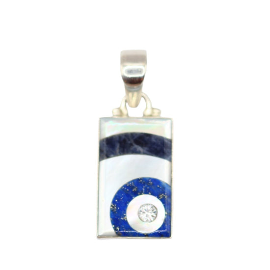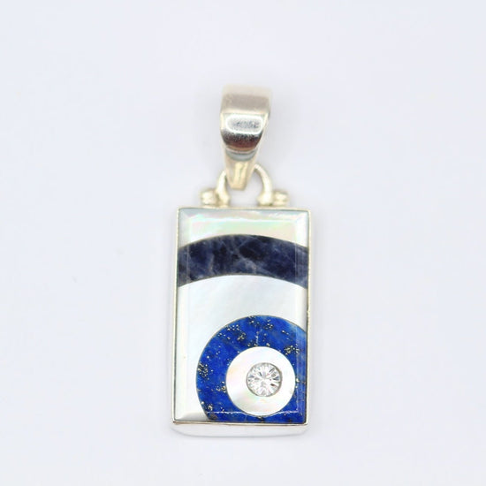 Find glamour and luxury in this art deco styled unique 925 silver pendant. Featuring a simple baguette shape, it is the geometric design ethic in this pendant that makes it a showstopper. It is handcrafted with sterling silver and showcases natural blue Lapis Lazuli with Pearl and a twinkling topaz.