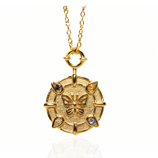 Wherever your family flutters away, keep their memories close to your heart with this four corners compass pendant. This disc pendant is crafted in a vintage fashion with exquisite detailing in the compass and an exotic butterfly at the centre. Surrounded by cubic zirconia in rich colours pointing across the globe, the sterling silver pendant is absolutely charming.