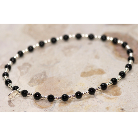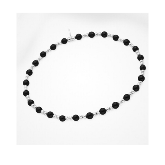 Treat yourself to this versatile silver Bracelet. This fashionable piece features beads of sterling silver and onyx, perfectly designed to complement both daytime and evening wear. With a stretch elastic band for adjustable fit, this versatile accessory goes with everything. Welcome the power of black onyx into your life, this is the 'stone of strength' worn as a talisman by ancient Greek and Romans for protection and bravery.