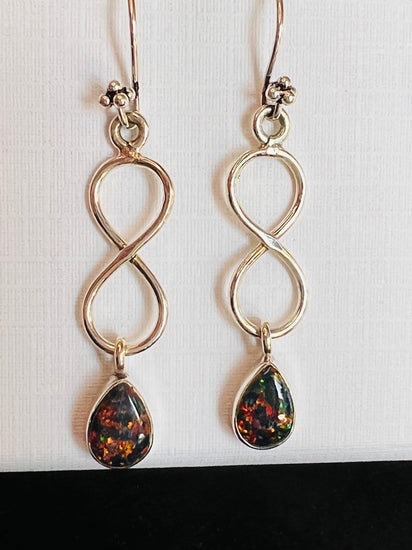 These lovely earrings have strong opal colours coming through to reflect the lights. Set on an infinity drop in sterling silver the style carries the gaze down to the 'firey' gems at the base. These are lab created Australian opals and the colour refraction is astounding in sunlight.