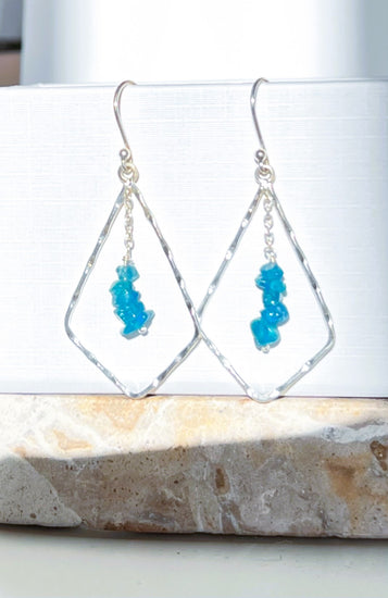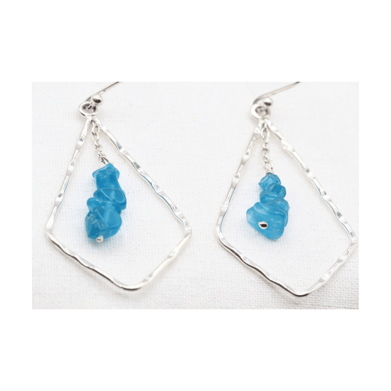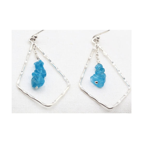 Take a look at these eye catching blue and silver earrings featuring natural 'rough' blue apatite inside a twisted diamond shaped silver frame. These are the earrings you have been looking for, perfect for days out, these drop earrings are unique and set with true gemstones. They are handcrafted in 925 sterling silver and swing gently on the dangle hook setting.