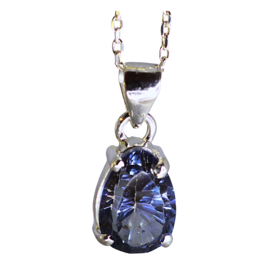 This sparkly and captivating handcrafted sterling silver pendant showcases a mystic rainbow topaz with iridescent colours. Amongst its qualities, topaz is believed to enhance intuition and psychic abilities.