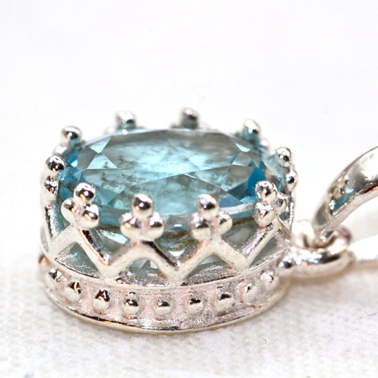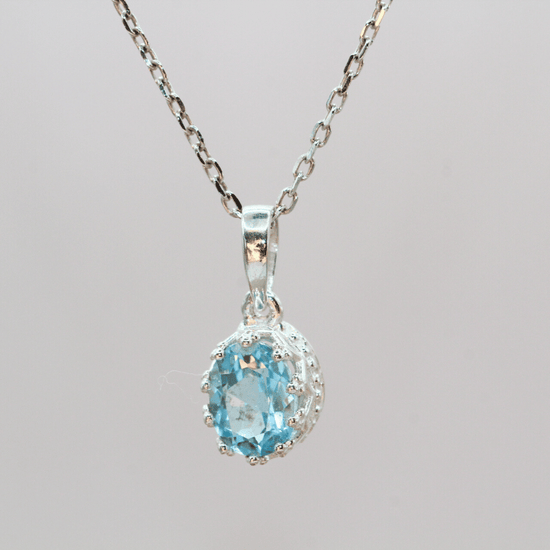 This sweet Blue Topaz Silver Pendant sits in a princess crown setting. The handcrafted oval pendant is made in sterling silver, creating a timeless and elegant piece.
