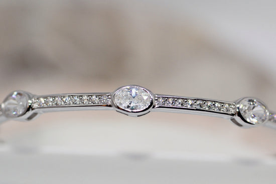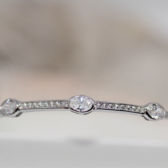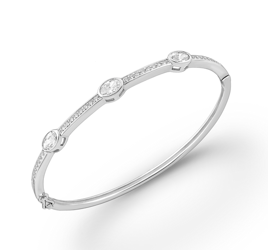 This dazzling silver bangle is a sophisticated bracelet with a high polished finish that softly gleams on your wrist. The hinged bangle has bezel and pave set cubic zirconia stones that sparkle in the light. This is a quality item that would make a lovely keepsake or gift for a special occasion.