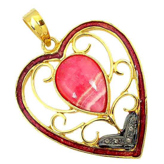 Add a touch of timeless romance to your collection with the True Love Heart Pendant from Seafire Jewellery. This large sterling silver pendant holds the enchanting love stone Rhodochrosite in its centre. The open-styled pendant showcases the swirling elegance of the Victorian era, highlighted by a bed of tiny sparkling diamonds. Encased in an enamelled frame with a deep red hue, the pendant's luxurious gold-plated glow adds an extra layer of sophistication. Known as Inca Rose, the rhodochrosite is celebrated for its ability to attract love, making this piece beautiful and meaningful.