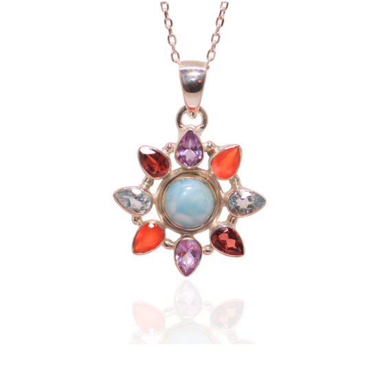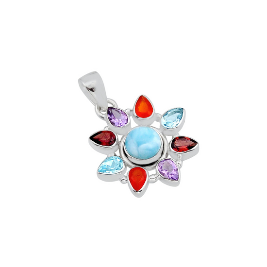 Let your daring spirit shine with this striking star pendant, adorned with a smooth Larimar stone and dazzling gemstones of Garnet, Blue Topaz, Cornelian, and Amethyst. A true conversation starter and a bold statement piece.